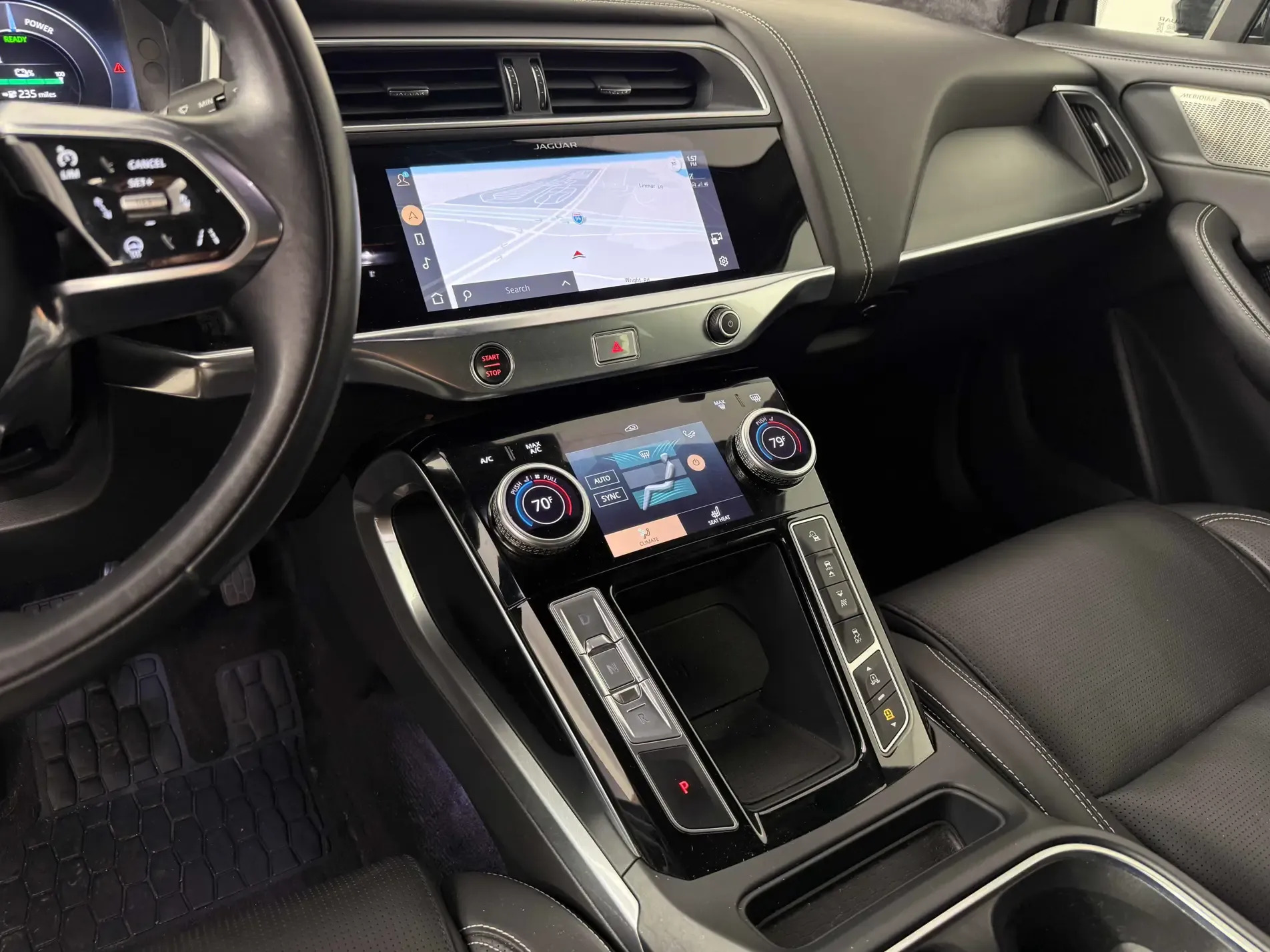 Inside, the I-PACE HSE offers a spacious and luxurious cabin crafted from high-quality materials such as premium leather, Suedecloth, and wood accents. It features a 12.3-inch digital instrument cluster and a 10-inch touchscreen for the intuitive Pivi Pro infotainment system, which integrates Apple CarPlay, Android Auto, navigation, and voice control. The Meridian sound system enhances the in-cabin experience, delivering crystal-clear audio for an elevated ride.